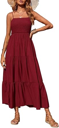 FEATURES: summer dresses for women features adjustable spaghetti strap, cami sun dress, shirred stretchy bodice, solid color, stretchy elastic high waist, tiered dress, flared ruffle flowy skirts, Ankle length maxi dress,Casual boho style