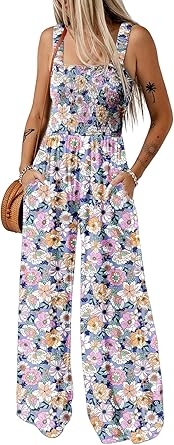 Dokotoo Women’s Casual Loose Overalls Jumpsuits One Piece Sleeveless Printed Wide Leg Long Pant Rompers With Pockets