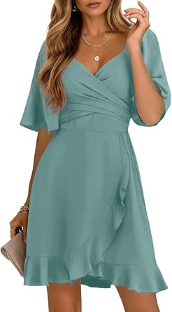 Mini Dress For Women 2025/Short Flared Sleeve Dresses/Ruffled Hem A-Line Dress/High Waist Flowy Dress/Wrap V Neck Solid Dress/Tiered Flowy Dress For Women/Swing Dress With Belt/Summer Dress For Women/Fit And Flare Dress For Women/Lightweight Chiffon Dress/Beach Dress For Women