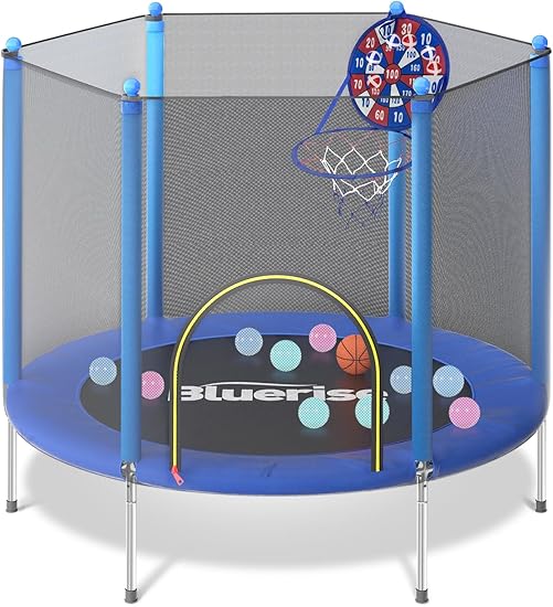 BLUERISE 55IN 6FT Toddler Trampoline for Kids Indoor Outdoor Play for Kids Trampoline Basketball Hoop Attachment with Enclosure Net Easy to Assemble