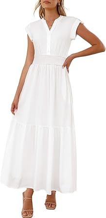 Women Summer Maxi Dress 2025 Cap Sleeve V Neck Button Casual Loose Ruffle Tiered A-Line Long Flowy Beach Sundress