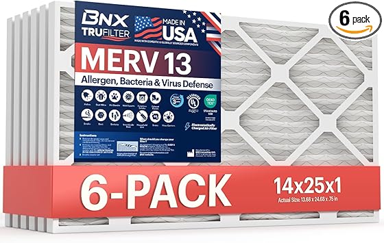 BNX TruFilter 14x25x1 Air Filter MERV 13 (6-Pack) – MADE IN USA – Electrostatic Pleated Air Conditioner HVAC AC Furnace Filters for Allergies, Pollen, Mold, Bacteria, Smoke, Allergen, MPR 1900 FPR 10