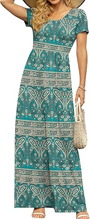 【UNIQUE DESIGN】 Short sleeve swing dress/Summer maxi dress for women/Elegant empire waist dress/Loose fit long dress/Summer beach dress for women/High waist a-line dress/Spring dress with pockets/Pleated casual dress/Flowy Crewneck dress/Fit and flare dress for women
