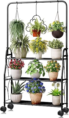 Plant Stand, 3 Tier Moveable Tall Corner Hanging Plant Rack for Indoor Outdoor, Black Heavy Duty Metal Multiple Plant Shelf Holder for Garden Balcony Living Room