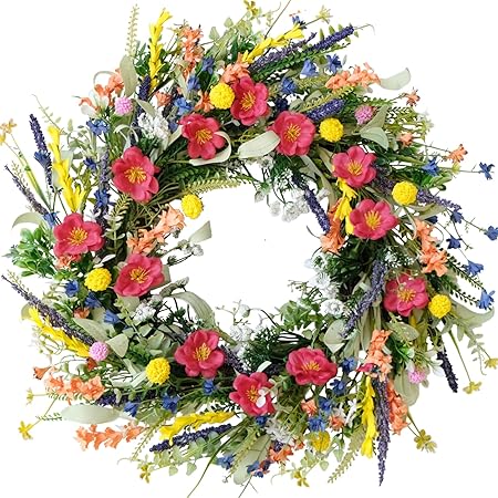 TEMPUS 22” Wildflower Wreath Spring and Summer Artificial Flower and Lavender Wreath for Front Door Home Wall Wedding Holiday Farmhouse Holiday Decoration