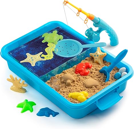 Sensory Bin W 1.5 LB Play Sand, 10 Sand Toys, 6 Sea Animal Toys, Dino Eggs, 1000 Crystals -Sensory Toys for Toddlers 3-4, 5-7, Fine Motor Skills Toys and Sensory Activities for Kids Ages 3+