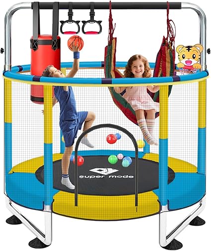 Adjustable Gymnastic Bar & Rings for Active Play: The height-adjustable gymnastic bar (59–62 inches) grows with your child. Equipped with durable rings, this trampoline turns into a fun mini gym that builds strength, balance, and coordination, helping your kids stay active and healthy