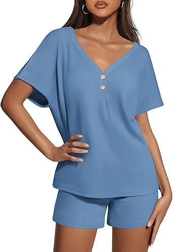 FEATURES: 2 Piece lounge sets, loose waffle knit pajama sets, henley neck short sleeve top, and the buttons can be opened, matching outfits shorts designed with side pockets.